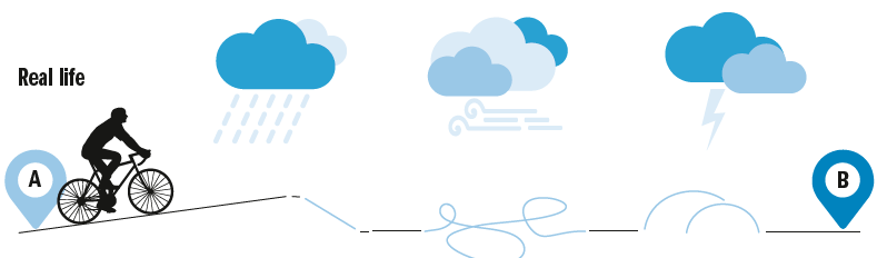 Neben den richtigen Fragen und dem Hinweis auf ein fokussiertes Wie ist der Einbezug der Zeit eine weitere notwendige Zutat für einen gelungenen Kurswechsel. Änderungen ergeben sich leichter durch kleine Anpassungen, die ähnlich einem langsamen und erst spät sich bemerkbar machenden Zinseszinseffekt funktionieren. Dies bedeutet allerdings, dass der Fokus eher auf dem Prozess und weniger auf dem Ziel liegen sollte. Anstatt ruckartig das Ruder herumzureißen, gilt es kleine Handlungen vorzunehmen und auf den Prozess zu vertrauen.