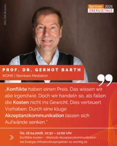 Unternehmen blenden die betriebswirtschaftlichen Konfliktkosten bei Energie-Infrastrukturprojekten systematisch aus. Doch Konflikte haben einen Preis. Doch wir handeln so, als fallen die Kosten nicht ins Gewicht. Die Folgen sind fatal. Denn: Das fehlende Kostenbewusstsein kann zu enormen wirtschaftlichen Schäden führen. Dies gilt vor allem dann, wenn Konflikte eskalieren. Darüber spricht Prof. Dr. Gernot Barth am 16. April 2026 zu den Berliner Energietagen.