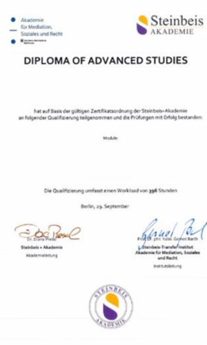 Bei erfolgreichem Abschluss erhalten Sie ein anerkanntes Zertifikat der Steinbeis+Akademie, einer der größten privaten, staatlich anerkannten Hochschulen Deutschlands. Zahlreiche Führungskräfte haben hier studiert, und die Hochschule genießt einen ausgezeichneten Ruf in der Wirtschaft.